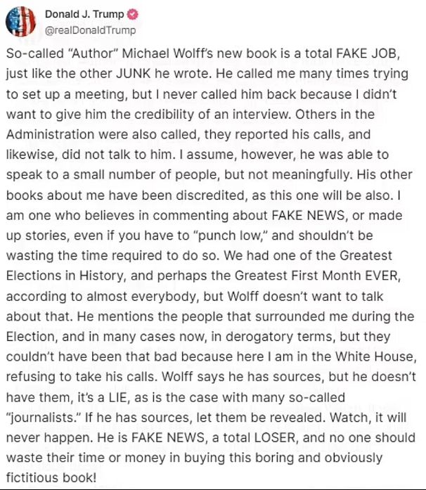 Trump a poursuivi: «Wolff dit qu’il a des sources, mais il n’en a pas, c’est un mensonge, comme c’est le cas avec de nombreux soi-disant« journalistes ». S’il a des sources, laissez-les révéler. Regardez, cela n’arrivera jamais.