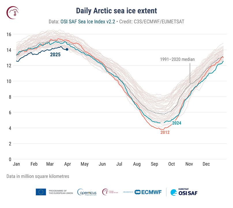 Le rapport de Copernic en mars 2025 souligne également une tendance préoccupante dans l’Arctique – où la glace de mer a atteint son niveau mensuel le plus bas pour mars dans le record par satellite de 47 ans, à 6% en dessous de la moyenne. Tous les mois de 2025 ont jusqu’à présent établi un niveau record pour la période de l’année.