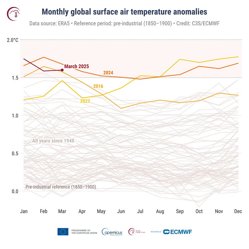 Cela a fait mars 2025 le 20e mois au cours des 21 derniers mois pour lesquels la moyenne de la température était supérieure à 1,5 ° C au-dessus du niveau pré-industriel – le seuil fixé par l’accord de Paris selon lequel le monde vise à ne pas dépasser à long terme.