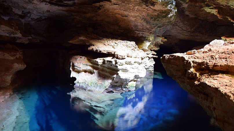 Poço Azul, près de la petite ville de Riachão dans la région nord-est du Brésil, ressemble beaucoup à Poço Encantado – une magnifique grotte aux eaux d’un bleu intense cachée dans le paysage sec de Bahia.