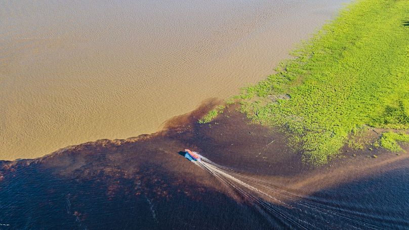 Sur une longueur de 6 kilomètres, deux rivières – le Rio Negro et la rivière Solimoes – coulent côte à côte sans se mélanger, créant deux flux parallèles d’eau de couleur noire et d’eau plus claire, de couleur sable.