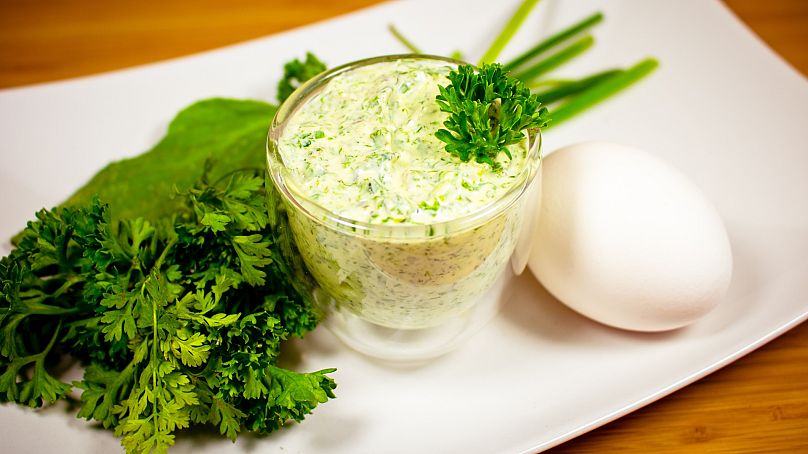 Nous savons que c’est l’été et que vous souhaitez vous en tenir aux repas légers, alors au lieu de l’habituelle Frankfurter Würstchen (saucisse de Francfort), pourquoi ne pas essayer une Grüne Soße plus fraîche ? Il s’agit d’une assiette populaire composée de crème sure et de sept herbes fraîches, dont l’oseille, la ciboulette et le barnet. Il est souvent servi avec des pommes de terre et des œufs durs.