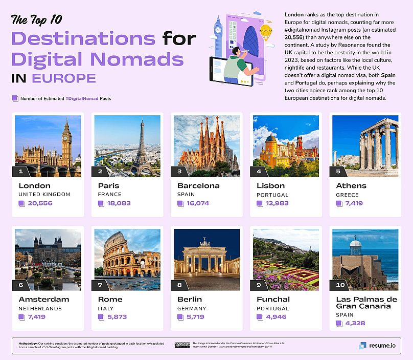 La capitale britannique a enregistré plus de 20 000 hashtags ce mois-ci. Bien qu’elle n’offre pas de visa nomade numérique spécifique – et les loyers sont exorbitants – la grande culture, la vie nocturne et les restaurants de la ville s’avèrent être un grand attrait pour les travailleurs à distance à la recherche de bons moments.