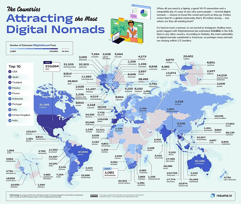 Les chercheurs de resume.io, un site de création de CV, ont parcouru des milliers de messages contenant le hashtag #digitalnomad et ont utilisé des emplacements géolocalisés pour déterminer les endroits les plus populaires.