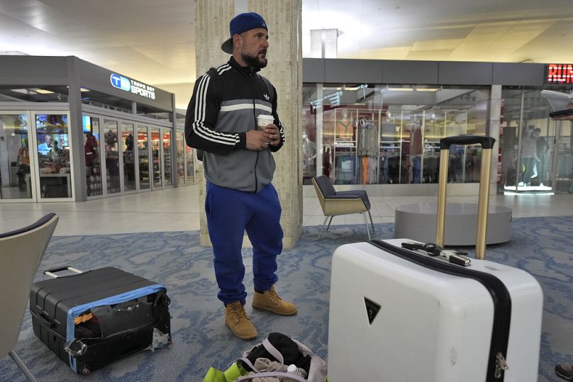 Un passager attend une aide au transport pour se rendre dans un refuge après l'annulation de son vol mardi à l'aéroport international de Tampa.