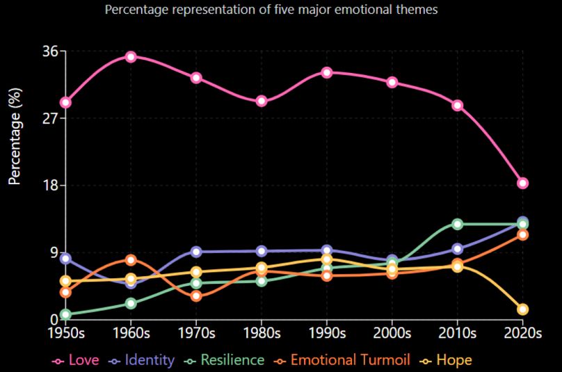 Le rapport montre également à quel point les sujets étaient importants dans les paroles au fil des décennies.