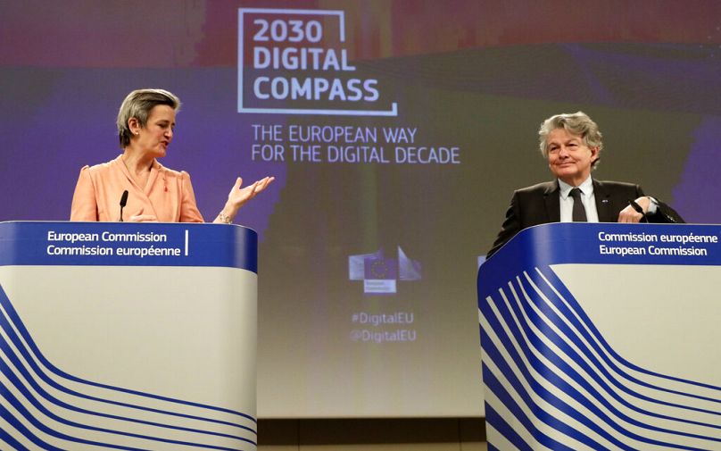 La vice-présidente exécutive européenne Margrethe Vestager et le commissaire européen chargé du marché intérieur Thierry Breton s'adressent aux médias à Bruxelles, en mars 2021.