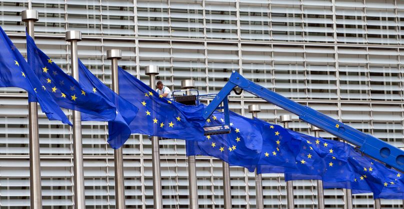 Un ouvrier dans un ascenseur ajuste les drapeaux de l’UE devant le siège de l’UE à Bruxelles, juin 2016.