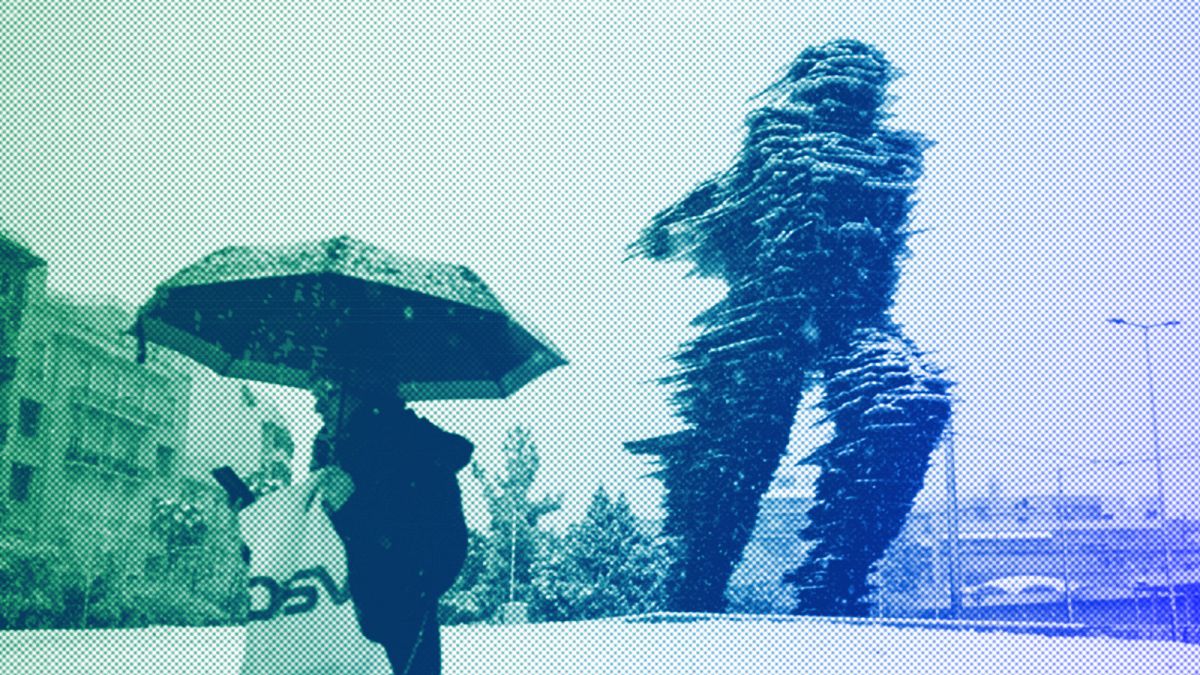 A woman with an umbrella walks past the Runner, a sculptured by Kostas Varotsos, during a snowstorm, in Athens, February 2023