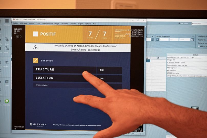 Un médecin regarde un écran aidé par l'IA pour l'imagerie médicale qui indique d'éventuelles fractures osseuses et luxations au CHU de Rennes, septembre 2023