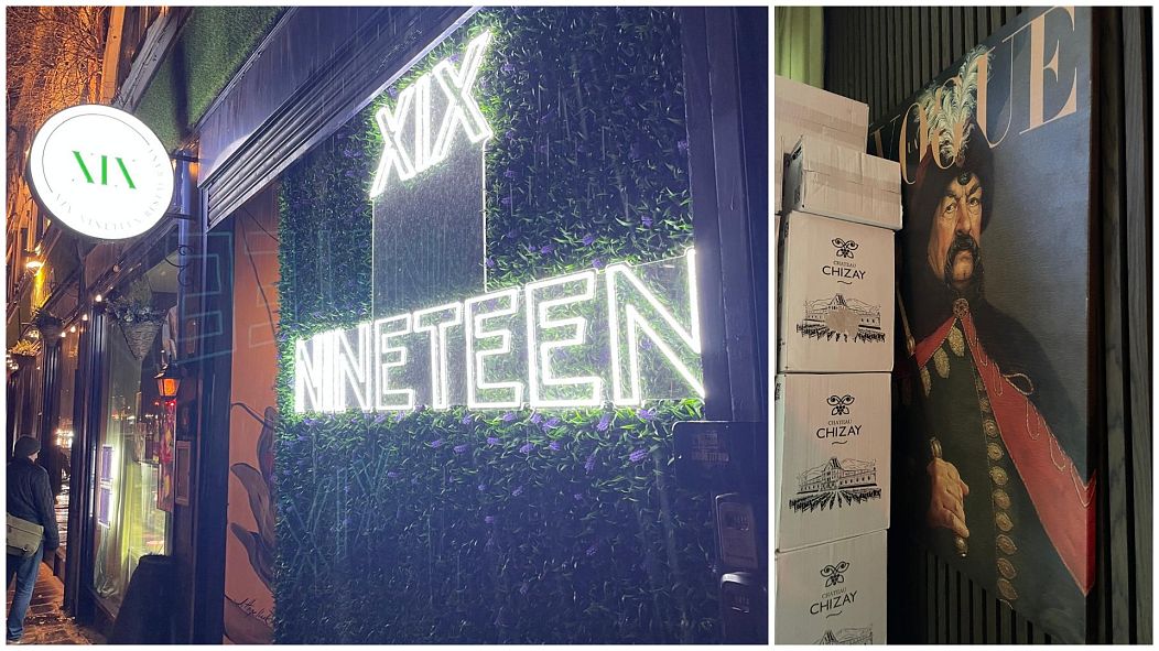 En entrant XIX, un restaurant ukrainien à seulement quelques minutes à pied de la gare ferroviaire internationale de Stratford, j’espionne une affiche de dessin animé de Staline ornant une fausse couverture avant de Vogue jetant furtivement un coup d’œil à tous les clients arrivant derrière une pile de boîtes à vin ukrainiennes.