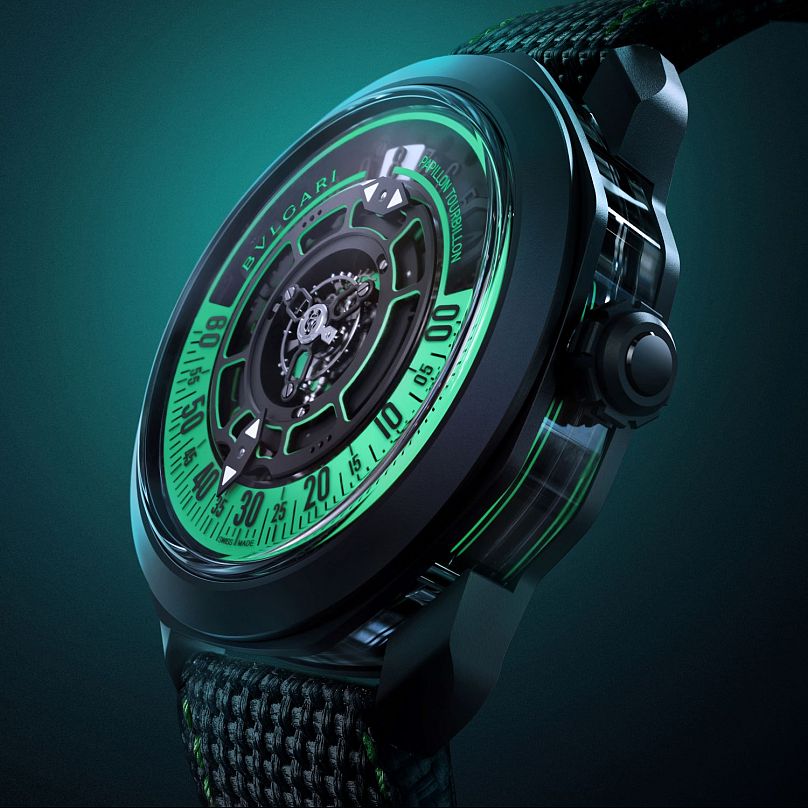 La première nomination de la marque est l’Octo Roma Striking Papillon Tourbillon, un design audacieux avec un boîtier octogonal en titane et des détails vert citron sur le cadran, unique car il s’agit d’une montre techniquement complexe avec un look plus contemporain.