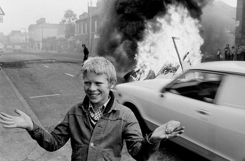 La photo d’un jeune garçon tenant une pierre lors des émeutes de 1978 en haut de Leeson Street a été prise par le photographe Chris Steele-Perkins, qui s’est rendu en Irlande du Nord à la fin des années 70. Ses images ont été rassemblées dans un livre intitulé « Les Troubles ».