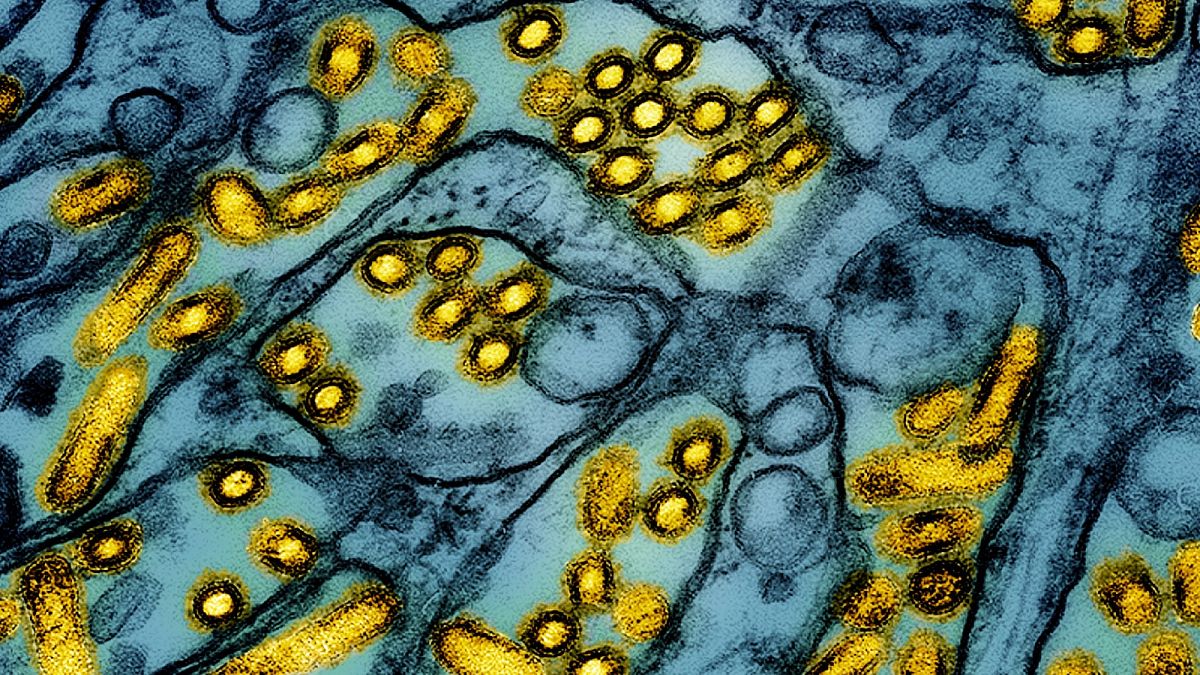 This colorised electron microscope image shows avian influenza A H5N1 virus particles (yellow).