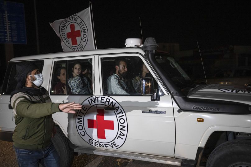 Un véhicule de la Croix-Rouge transportant des otages israéliens passe au point de passage de la bande de Gaza vers l'Égypte à Rafah, le samedi 25 novembre 2023.