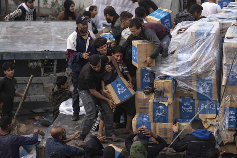 DOSSIER – Des Palestiniens pillent un camion d’aide humanitaire alors qu’il traversait la bande de Gaza à Rafah, dimanche 17 décembre 2023