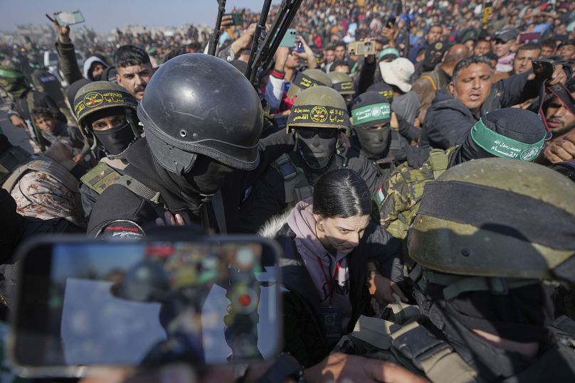 Les otages ont été conduits à travers des scènes chaotiques de foules acclamées, escortées par des hommes armés armés.
