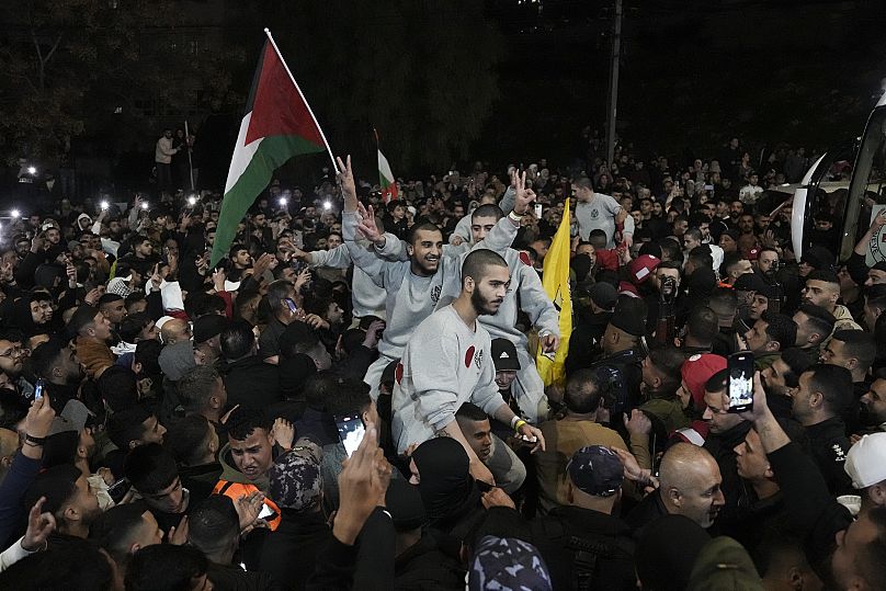 Les anciens prisonniers ont été accueillis par des milliers de Palestiniens applaudissants alors qu’ils ont été bus pour la ville de Ramallah de la Cisjordanie.