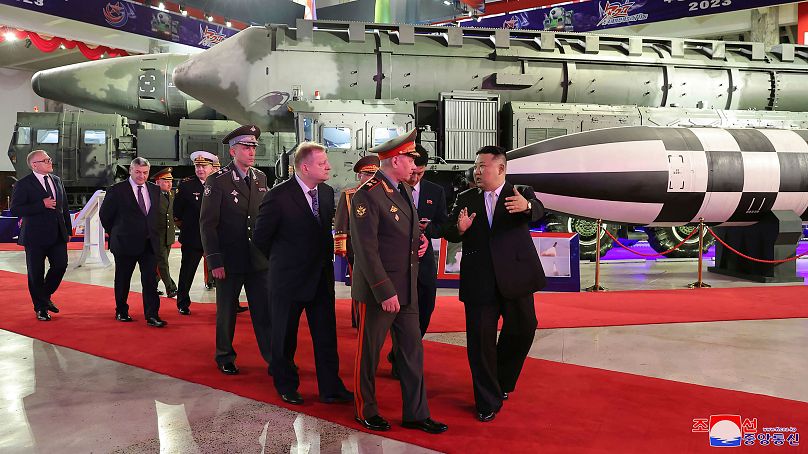 Selon KCNA, Kim a également emmené Shoigu à une exposition d’armes qui présentait certaines des armes les plus récentes de la Corée du Nord et l’a informé des plans nationaux visant à étendre les capacités militaires du pays. Les photos et vidéos des médias d’État de l’exposition montraient Kim et Shoigu marchant près d’une rangée de gros missiles montés sur des camions lanceurs.