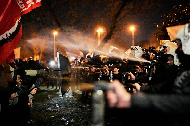 La police anti-émeute utilise du spray au poivre pendant les affrontements avec des manifestants à Istanbul, 20 mars 2025