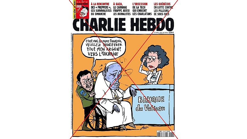 Une couverture avant présumée du magazine hebdomadaire satirique français Charlie Hebdo circule en ligne, se moquant du président ukrainien Volodymyr Zelenskyy et la mort du pape François.