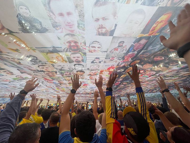 Une banderole révélant 182 photos de soldats ukrainiens tombés au combat et supporters de football a été partagée lors du match Ukraine-Belgique de l’Euro 2024.