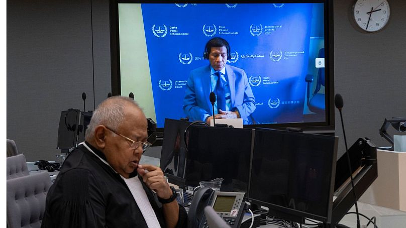 L’ancien président philippin Rodrigo Duterte, 79 ans, a comparu à l’audience sur le tribunal sur un écran vidéo d’un centre de détention à proximité à La Haye.