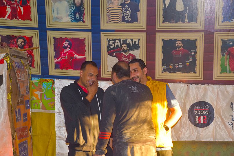 L’El-Alemy – qui signifie «mondial» en arabe – est un établissement semi-permanent modeste appartenant au cousin de Salah, Wael. À l’intérieur, l’articulation est ornée de banderoles, de drapeaux et de bannières dans le rouge de Liverpool saupoudré de jaune. Les centaines de photos de Salah étaient beaucoup plus évidentes, dont l’un de son visage superposé au Sphinx.