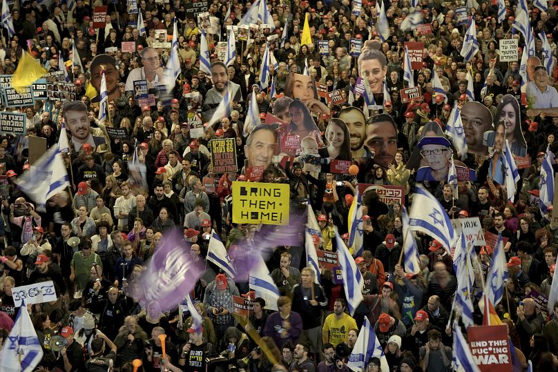Beaucoup portaient de faux cercueils drapés du drapeau israélien ainsi que des banderoles qualifiant le cessez-le-feu de « trahison » envers les soldats israéliens tués pendant la guerre.