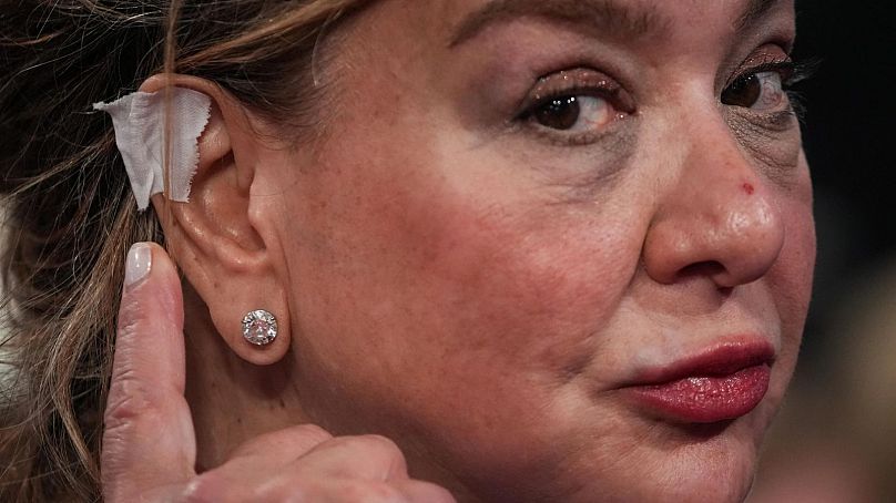 Plusieurs partisans portaient des bandages rectangulaires blancs sur leur oreille droite lors de la convention républicaine à Milwaukee, dans le Wisconsin, imitant Trump, qui portait un bandage similaire lors de la convention après avoir reçu une balle dans l’oreille.
