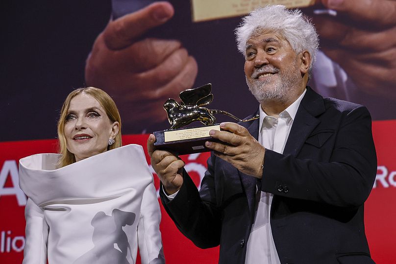 Pedro Almodovar, à droite, lauréat du Lion d'or pour « The Room Next Door », aux côtés de la présidente du jury Isabelle Huppert