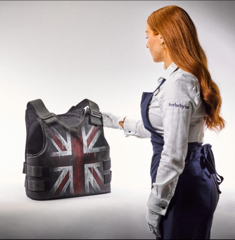Conçu par Banksy et porté par la star du grime Stormzy lors de son légendaire concert à Glastonbury en 2019, le gilet pare-balles du street artiste anonyme arborant l’Union Jack a été mis en vente avec une estimation allant jusqu’à 300 000 £ (360 000 €).