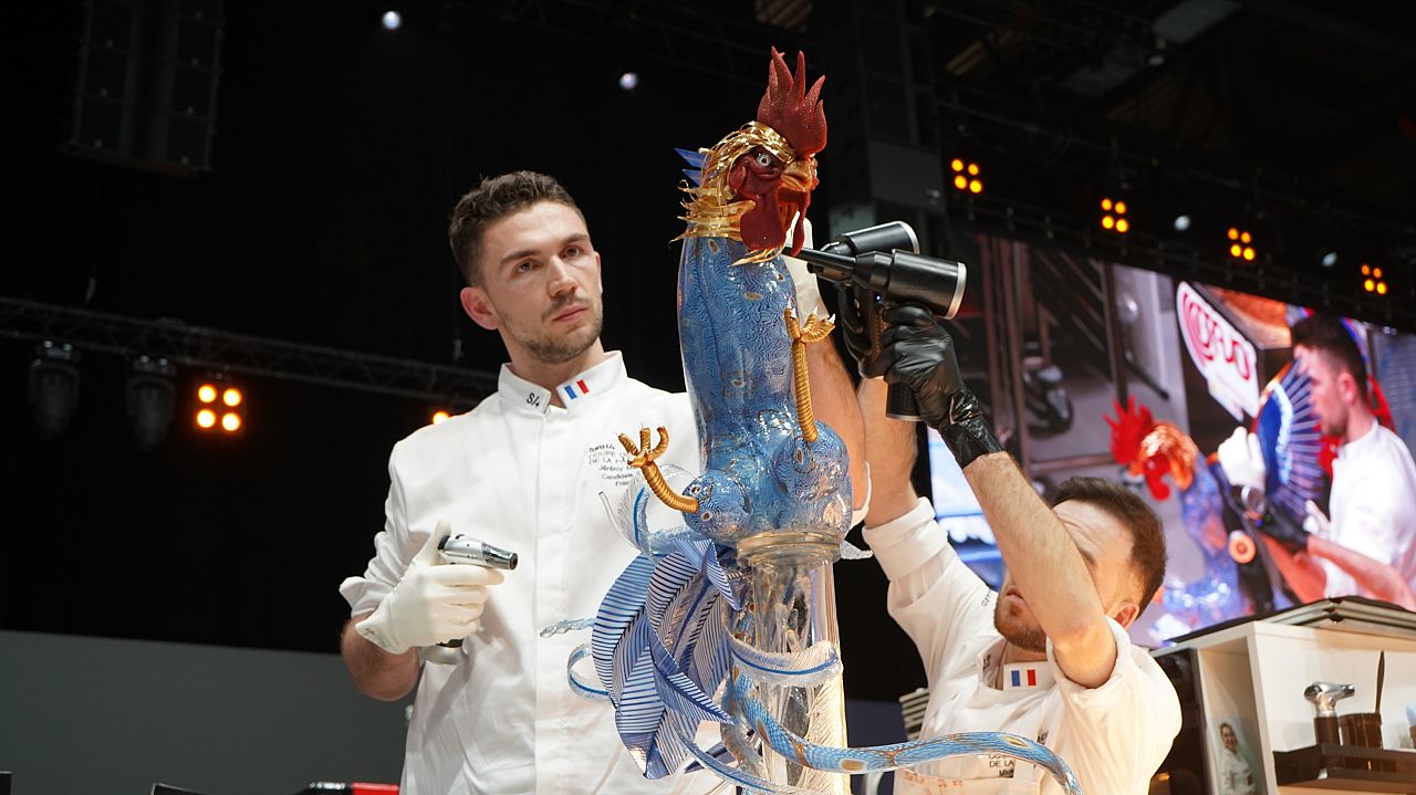 C’est une tâche ardue qui se déroule en marge du vaste salon SIRHA Food Service. Les supporters remplissent l’arène jusqu’aux chevrons, agitant des drapeaux, chantant et soufflant des klaxons pour soutenir leurs équipes, tandis que quelques compères commentent la course. L’atmosphère générale est celle d’une rencontre entre une foule de football et la télé-réalité.