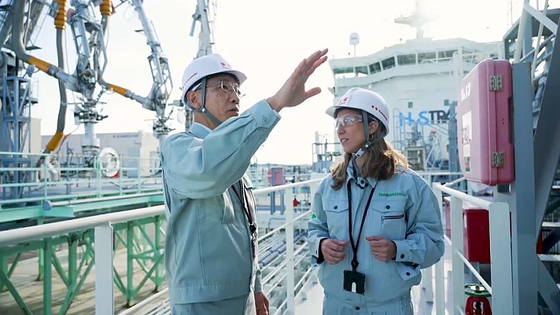« Ici on a le réservoir d’hydrogène, ici en bleu vous avez la bouche et en dessous il y a le réservoir. La taille du réservoir est de 1 250 mètres cubes », a révélé Yamamoto Shigeru, directeur général et directeur général adjoint de la division Stratégie Hydrogène de Kawasaki Heavy Industries, Ltd.