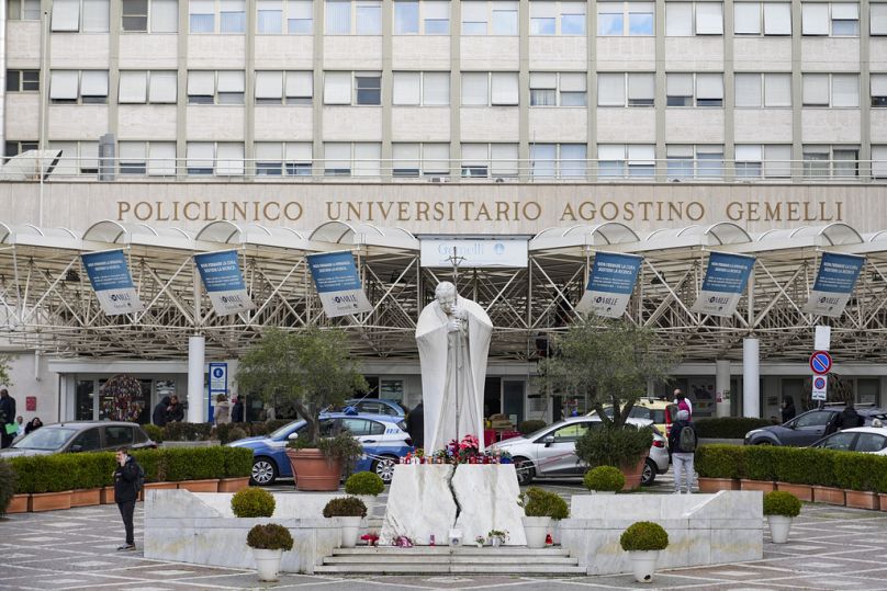 Une statue du pape Jean-Paul II est vue devant l'Agostino Gemelli Polyclinic, à Rome, le lundi 17 février 2025,