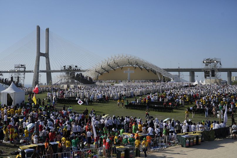 De nombreux jeunes du parc du Tejo, dans la capitale portugaise, Lisbonne, avaient campé pendant la nuit pour assister à la messe en plein air dimanche.