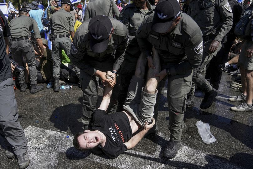 Des milliers de personnes ont également manifesté dans le centre de Tel-Aviv, l’épicentre de mois de manifestations anti-gouvernementales. Des échauffourées ont eu lieu entre la police et les manifestants, avec au moins huit personnes arrêtées et des manifestants allumant des feux de joie. La police a déclaré avoir arrêté un conducteur qui a frappé un groupe de manifestants dans le centre d’Israël, blessant trois personnes