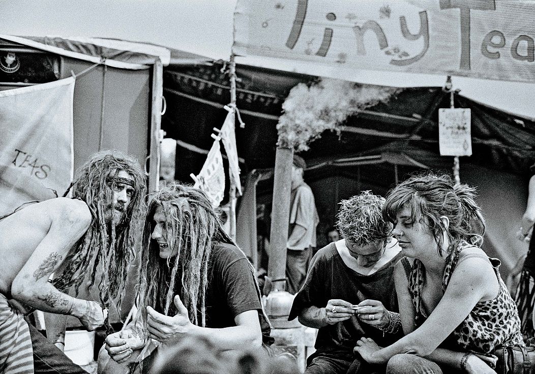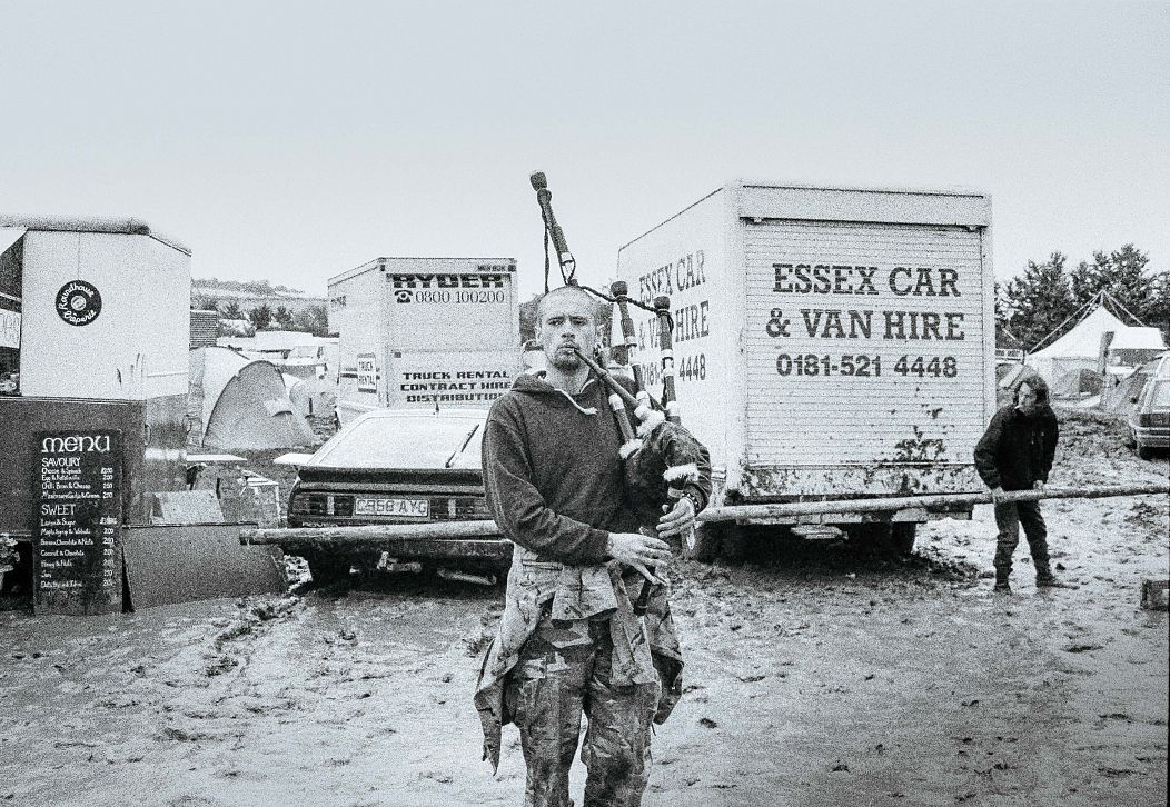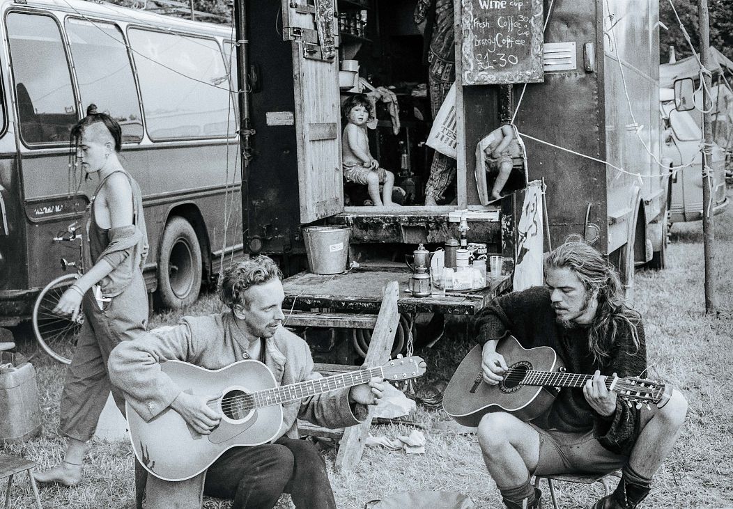 Les images du livre capturent l’anarchie sauvage qui s’étend dans le Somerset chaque année autour du solstice. Dans l’une, un monochrome granuleux datant probablement de ses débuts, deux hommes jouent de la guitare acoustique devant un camping-car qu’un enfant regarde avec curiosité.