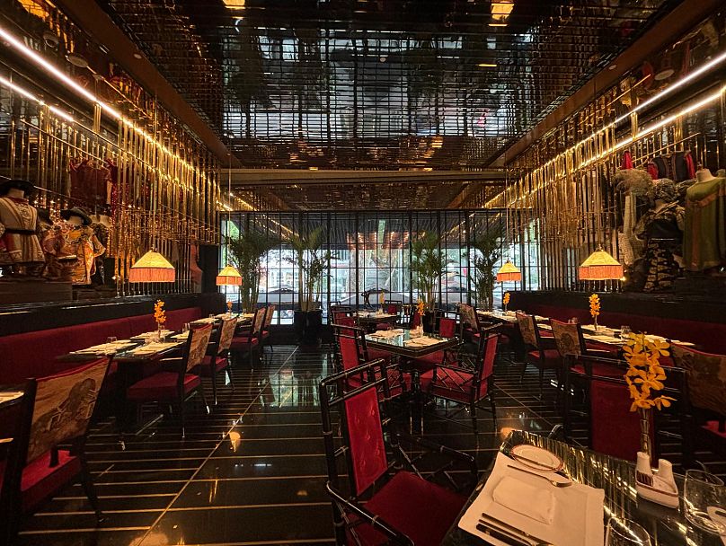Le restaurant recommandé au rez-de-chaussée Michelin est nommé dans les coulisses, et ses chaises en velours rouge moelleux, ses rideaux au sol au plafond et ses costumes scintillants accrochés aux murs évoquent parfaitement l’agitation des coulisses.
