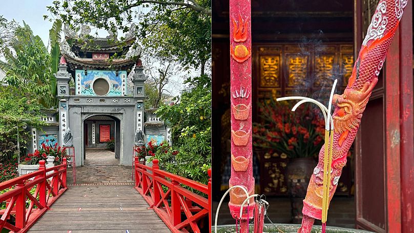 À l’extrémité nord se trouve le temple de Ngoc Son. Dédié à l’écriture, à l’étude et à la littérature, c’est un lieu de culte clé pour les étudiants qui se préparent aux examens. Un pont rouge vif mène à une petite île où le coup de la circulation devient un bourdonnement lointain à l’intérieur des murs du temple.