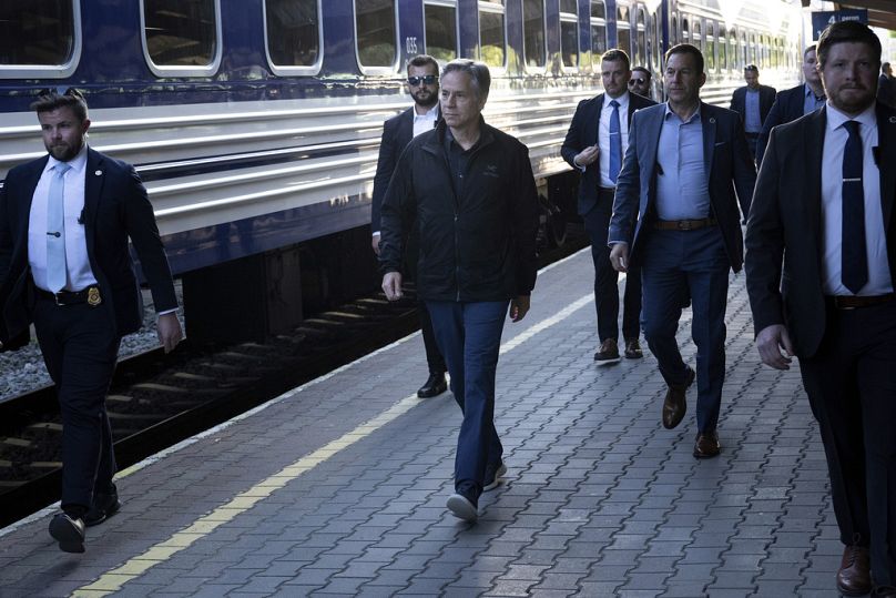Le secrétaire d'État américain Antony Blinken, au centre, monte à bord d'un train des chemins de fer ukrainiens à la gare de Przemysl Glowny alors qu'il se rend à Kiev, en Ukraine, le lundi 13 mai 24.