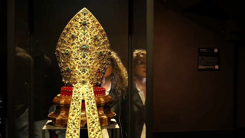 La mitre de l’évêque est l’une des pièces les plus précieuses de la collection. Il pèse 18 kg et est décoré de près de quatre mille pierres précieuses. Sa reproduction 3D permet aux visiteurs de toucher la mitre afin d’en apprécier pleinement la beauté.
