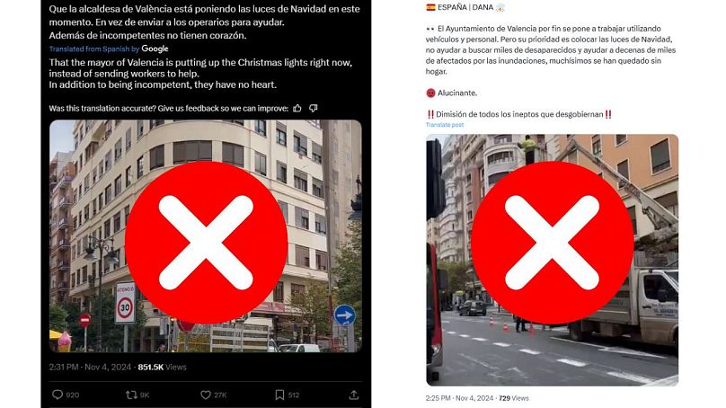 L’un des tweets dit : « Le maire de Valence est en train d’installer les lumières de Noël, au lieu d’envoyer des ouvriers pour aider. En plus d’être incompétents, ils n’ont pas de cœur. »