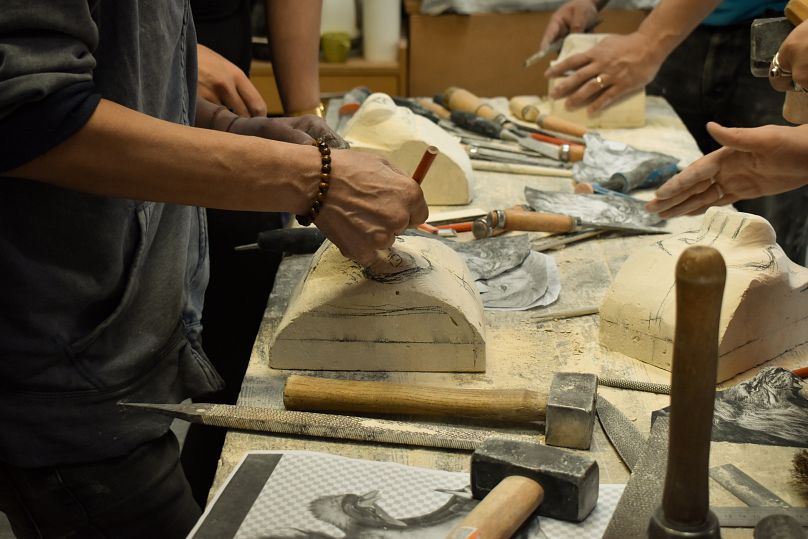 Dans son atelier de Belleville, à l’est de Paris, elle apprend à ses élèves à sculpter leur propre chimère de style Notre-Dame, en utilisant la même pierre calcaire. Il provient même de la même carrière utilisée pour les chimères de Notre-Dame, La Carrière du Clocher à Bonneuil-en-Valois. En seulement deux jours, les participants peuvent sculpter une tête de lion ; une chimère prend un peu plus de temps.