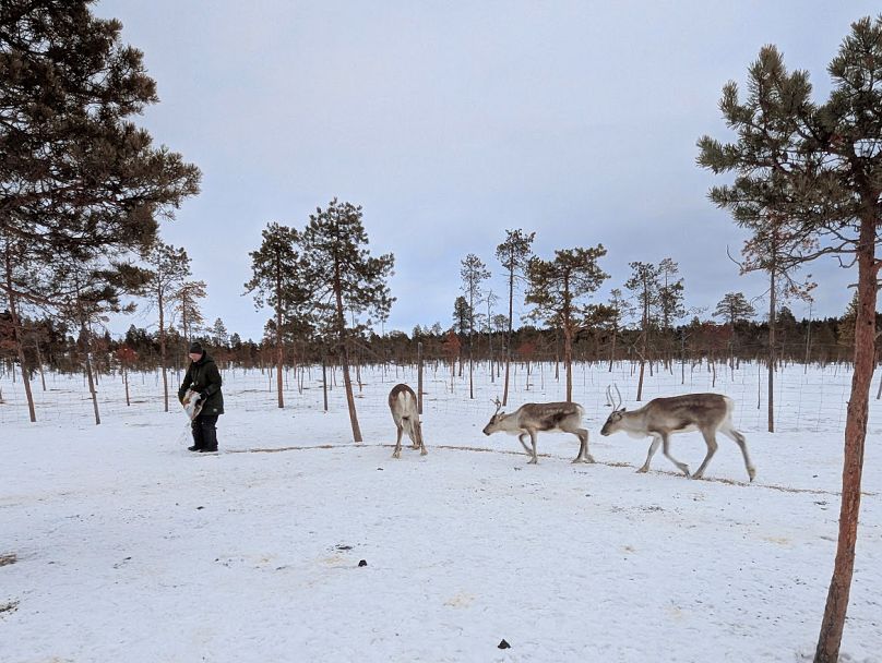 Forme des rennes autour de Raisa Kitti dès qu’elle entre dans le paddock, collant leur gros nez velouté dans le traîneau plein de nourriture qu’elle remorque.