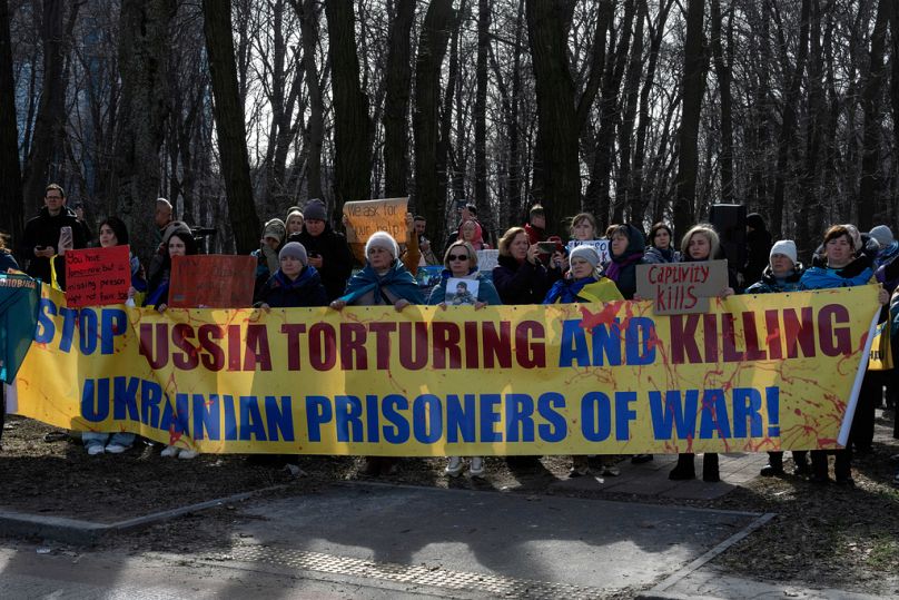 People attend a rally addressed to the US government, asking for help in freeing Ukrainian prisoners of war held captive in Russia, in front of the U.S. Embassy in Kyiv.