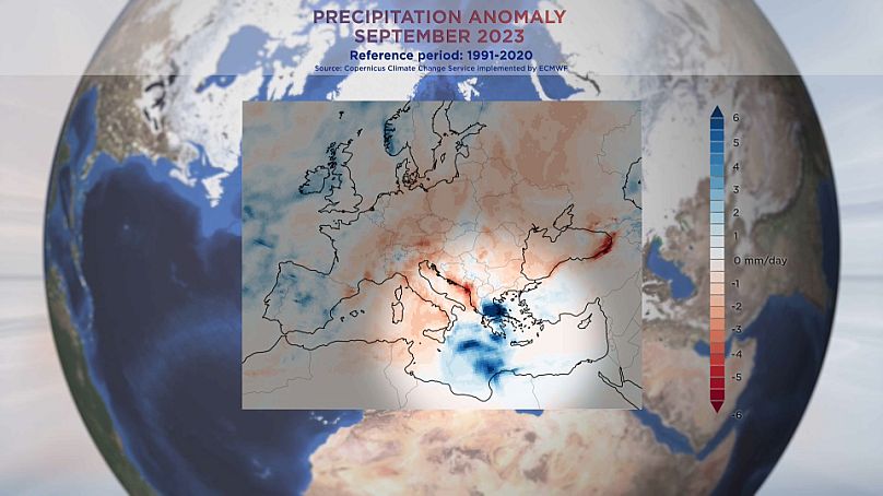 Il faisait chaud et dans certaines parties de l’Europe et de l’Afrique du Nord, il pleuvait inhabituellement. Cette carte d’anomalie de précipitations ci-dessous montre en bleu foncé les fortes pluies associées à la tempête Daniel. Elle a provoqué des inondations dévastatrices et meurtrières en Libye, en Grèce, en Turquie et en Bulgarie.
