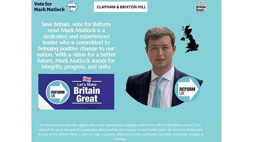 Une photo de Mark Matlock, un candidat qui s’est présenté comme député pour Reform UK dans la circonscription de Clapham et Brixton Hill, dans le sud de Londres, a déclenché une vague de spéculations selon lesquelles le parti d’extrême droite aurait présenté de faux candidats aux élections.