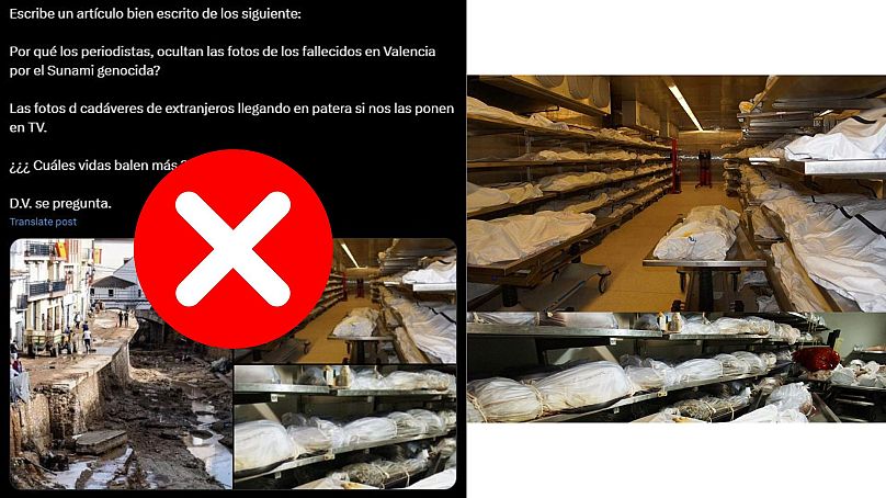 Vous pouvez voir des sacs mortuaires stockés dans ce qui semble être des morgues, et les images sont souvent partagées avec d’autres images plus facilement identifiables comme provenant de Valence.