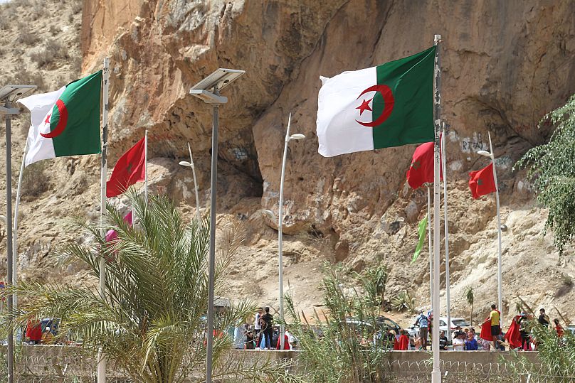 Une vue des drapeaux nationaux le long de la frontière fermée avec le Maroc dans la ville algérienne de Marsa Ben M'Hid, 11 août 2023